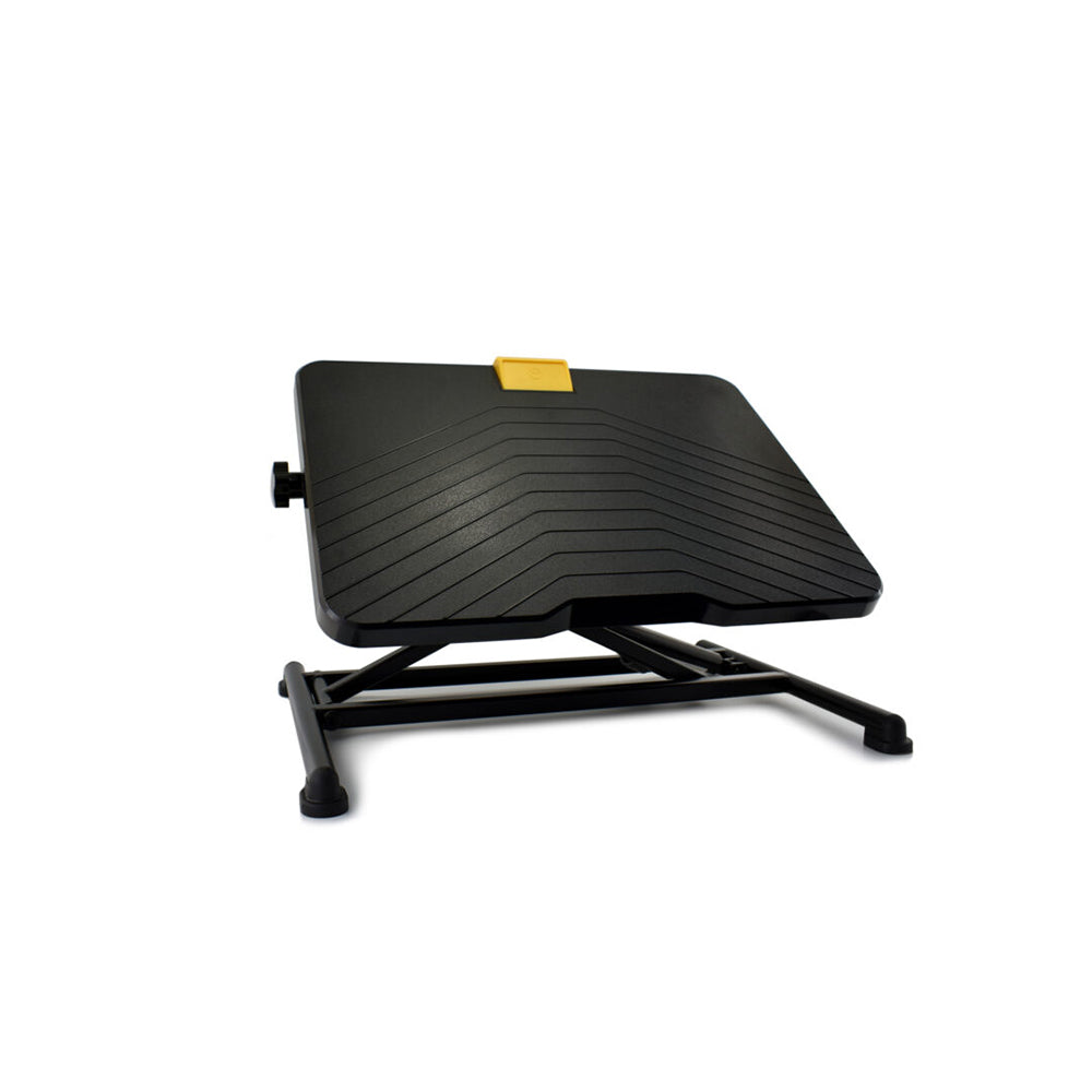 The Ergoapt Pro Footrest features a heavy metal frame and a spacious foot platform. The height of the foot platform can be adjusted via a large button located along the top, providing quick and convenient customisation via a gas lift mechanism. The angle of the foot platform can be locked in place at a desired angle or can be left dynamic, allowing for versatile positioning and movement.
