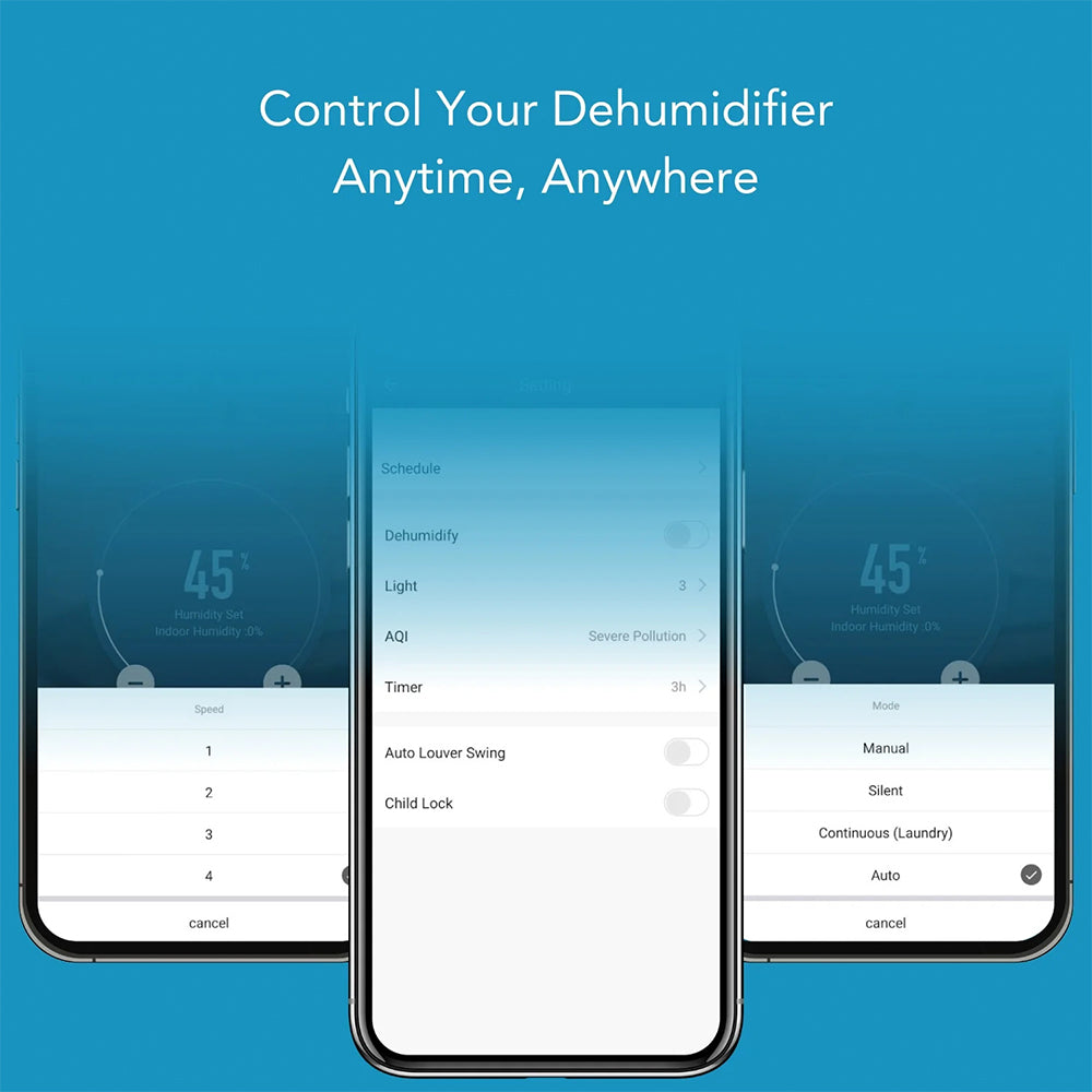 Functions: Dehumidify + Air Purify, Air Purify only Fan Speeds: 1 ~ 4 When dehumidifier function is enabled: Relative Humidity Levels: 40%RH to 80%RH in 5% increments, or CO for continuous dehumidification Modes: Manual, Silent, Continuous (Laundry), Auto |